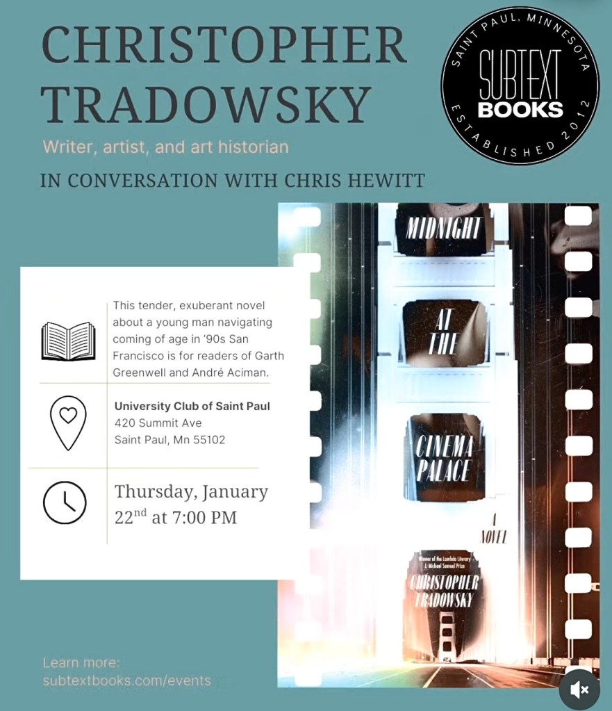 Reading at the University Club in St. Paul, sponsored by Subtext Bookstore. I will be in conversation with Chris Hewitt, book reviewer from the Minnesota Star Tribune.