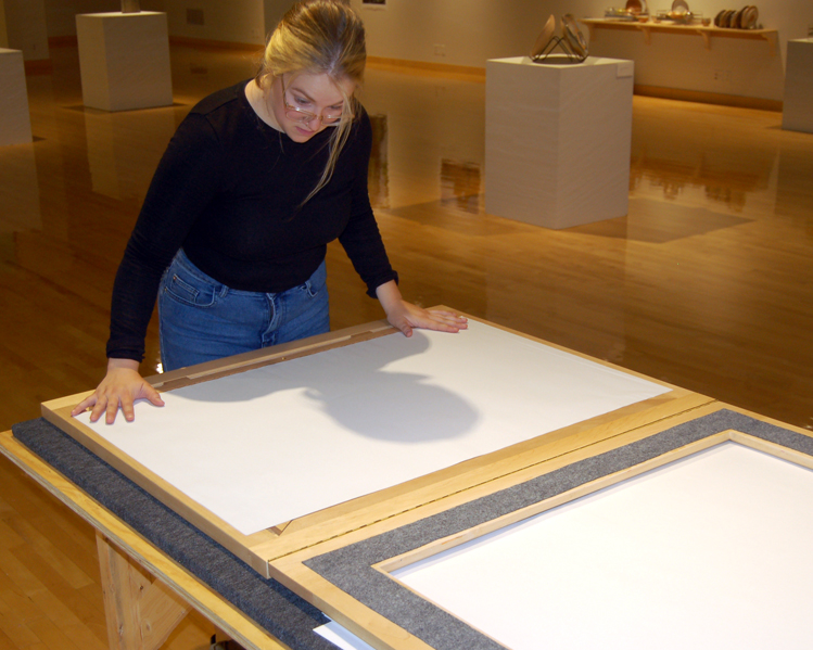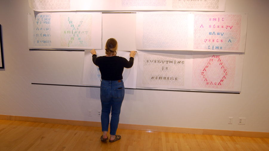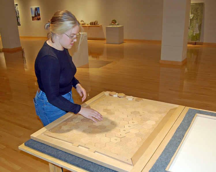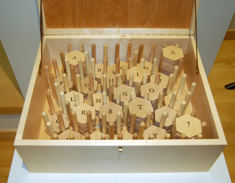 The Hexafolia Letterpress (2018) is a collaboration with my brother, Peter Tradowsky, a woodworker. We created a “Letterpress” using hexagonal wooden type. Visitors are invited to create broadsides by arranging the wooden tiles on the board and rubbing the pattern onto newsprint. Visitors are encouraged to play with the letterpress, seeing what they can produce. They may take the broadsides home or display them in the gallery. The installation pictured was on view in October 2018 at the Flaten Art Museum at St. Olaf College.
