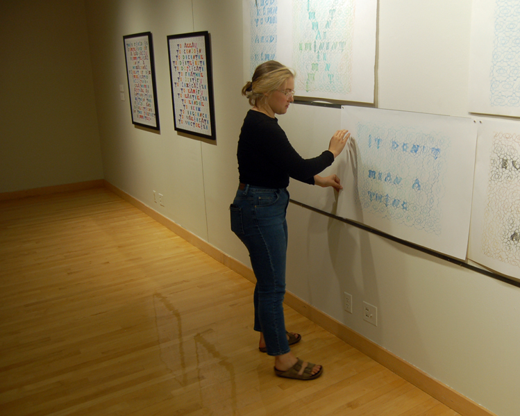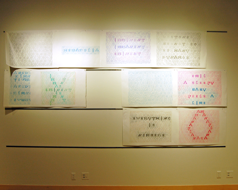 Nearly forty years ago, in a famous critique of Modernism, art historian Rosalind Krauss decried “the grid’s imperviousness to language…. [The grid] will not permit the projection of language into the domain of the visual….” Krauss argued that the appeal of the grid to avant-garde artists was that it presented a form so simplistic, so elementary, that it resisted all symbolic content, including written language, narrative, and pictorial representation. One strain of my visual art has been in response to this claim, a set of attempts to demonstrate that this is not necessarily so, and that there are many ways in which the grid form might facilitate language, and symbolic meaning more generally.