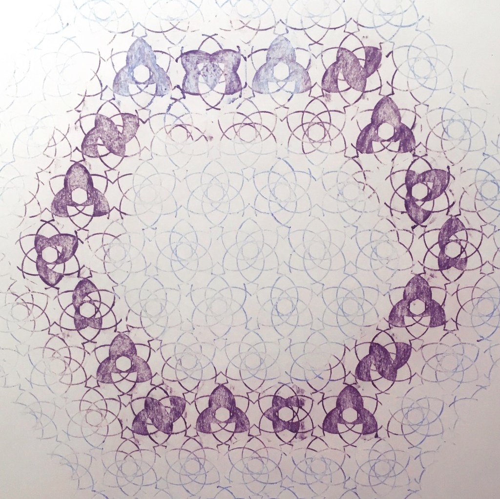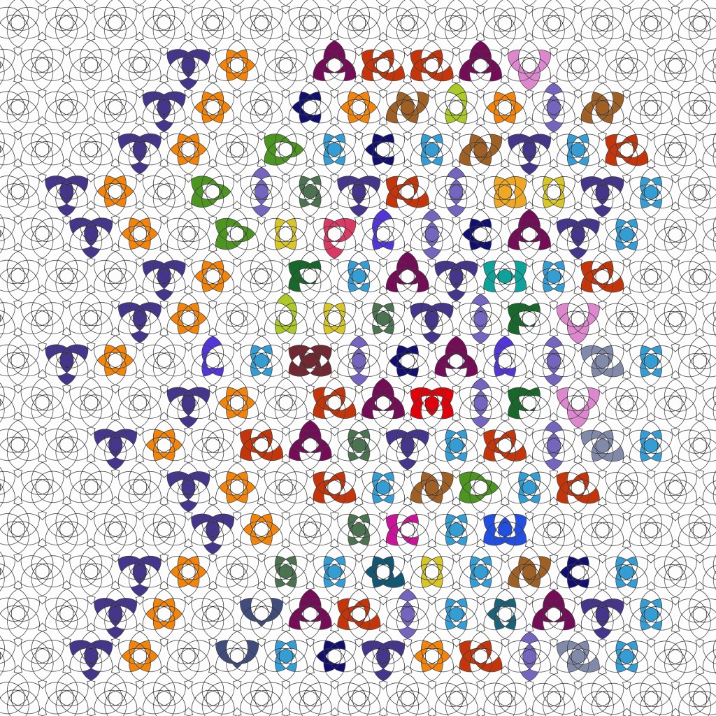 I call the font Hexafolia, meaning “six leaves,” because its basic unit is comprised of six ellipses arranged into a floret pattern. The rule governing the design of the font was simple: letters could be produced only by filling in sections of the floret, essentially “coloring within the lines” so as to preserve the underlying symmetry of the unit. The relative legibility of the letters, and their visual elegance or awkwardness, was secondary and subject to this rule. The result, when projected across a field, is a grid structure that can be entirely permeated by language. While the letters disguise the radial symmetry of the unit by blocking out sections, the grid both constrains and refracts the letters, in a way akin to the refractions of a kaleidoscope.